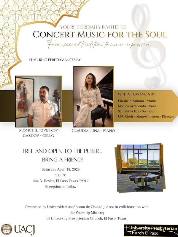 You are cordially invited toConcert Music for the SoulFree and open to the public!!Bring a friend!Saturday, April 18, 2026 7:00 PMJoin us on YouTube